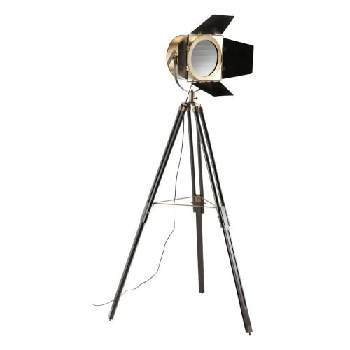 Ce lampadaire en métal prend la forme d’un projecteur monté sur un trépied en métal finition cuivrée.